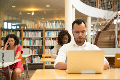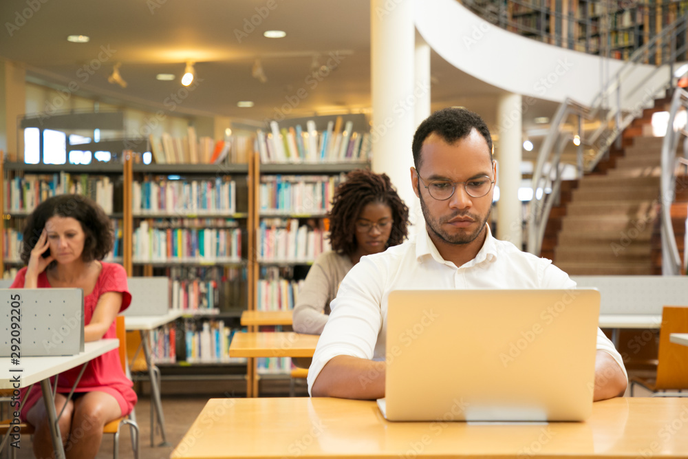 Wall mural focused adult students working in public library computer class. people sitting at desks and using l - Wall murals Wall mural focused adult students working in public library computer class. people sitting at desks and using l - Wall murals