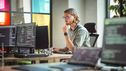 The watermark will not be included on Wall mural.: Focused caucasian man coding on desktop computer in stylish office space - male software engineer dev