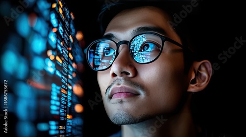 Wall mural : Focused coder analyzing data with screen reflections in glasses portrays technology and expertise