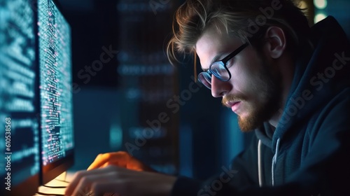Wall mural focused developer coder wears glasses working on computer. generative ai