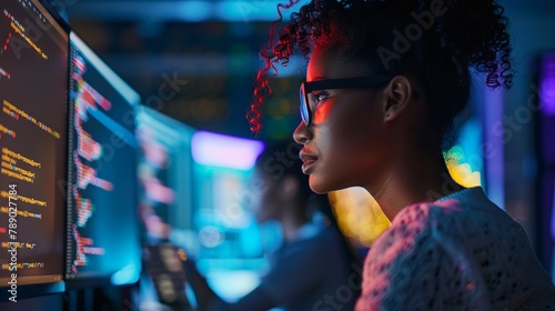 The watermark will not be included on Wall mural.: Focused female developer engaged in software programming on desktop in modern office setting