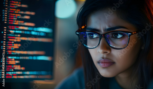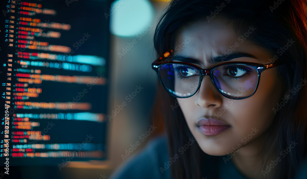 Wall mural focused female software engineer working on complex code, debugging serious issues, ensuring smooth