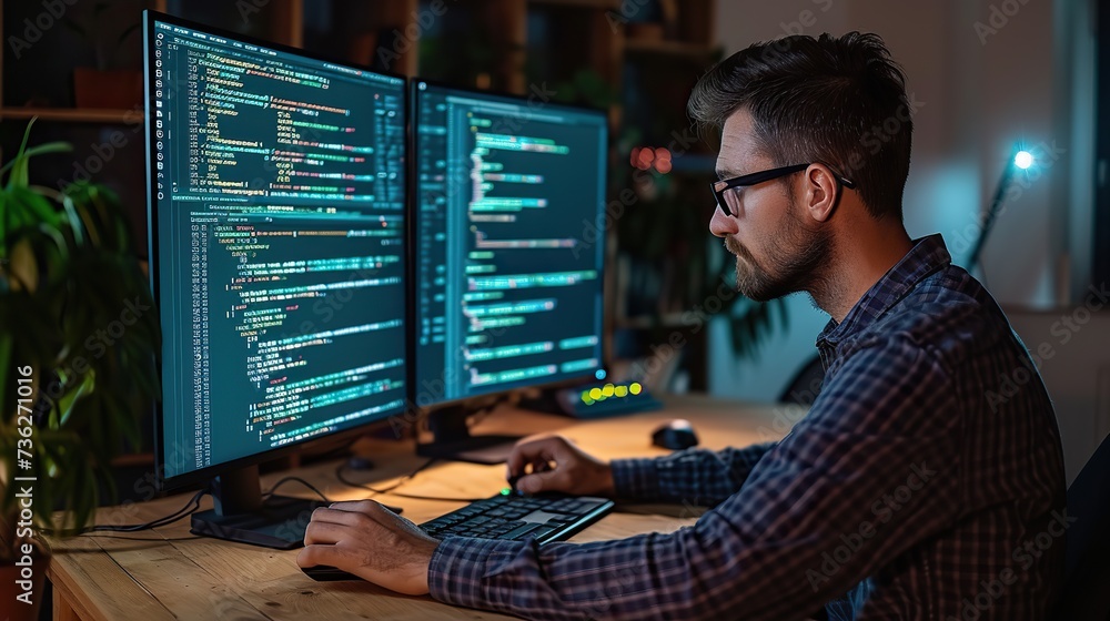 The watermark will not be included on Wall mural.: Focused male programmer coding on multiple monitors in a dark room, indicative of late-night softwar