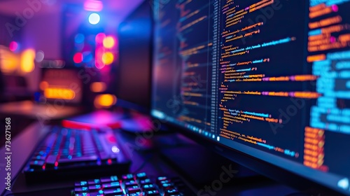 The watermark will not be included on Wall mural.: Focused on computer monitors displaying colorful code, illuminated by vibrant neon lights in a dark