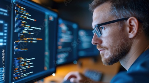 Wall mural : Focused professional male programmer coding and developing software on computer in busy office works