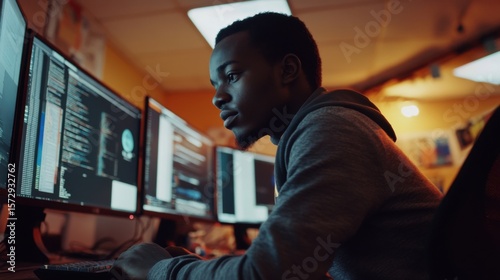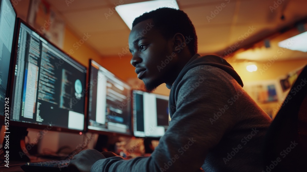 The watermark will not be included on Wall mural.: Focused programmer coding with multiple screens in dim lighting environment
