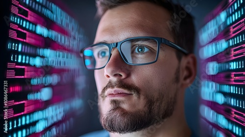 The watermark will not be included on Wall mural.: Focused programmer studying binary code on screen