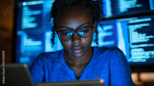 The watermark will not be included on Wall mural.: Focused programmer woman coding late night on tablet