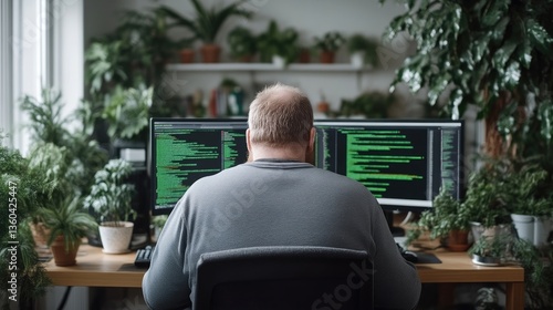 The watermark will not be included on Wall mural.: Focused programmer working at a home office with multiple monitors