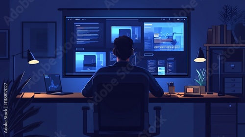 The watermark will not be included on Wall mural.: Focused programmer working late at night in a modern home office, surrounded by various open applica