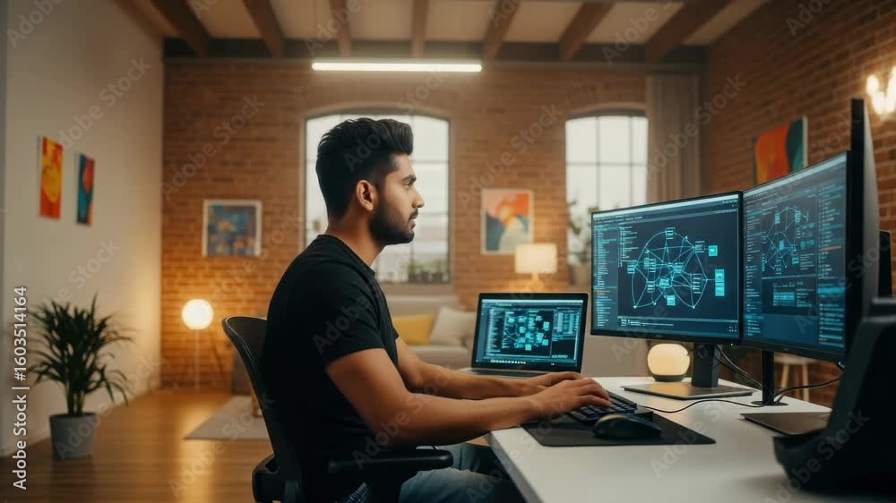 The watermark will not be included on Wall mural.: Focused programmer working on complex coding project at modern home office setting