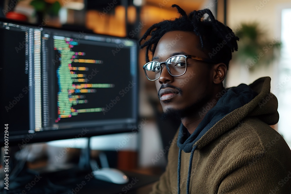 The watermark will not be included on Wall mural.: Focused programmer working on computer code at night - software developer looking at code on monitor