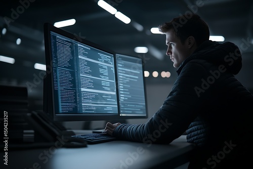 Wall mural : Focused software developer engrossed in code on dual screens in modern workspace