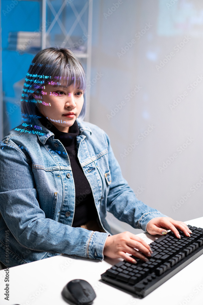 Wall mural focused software engineer working on coding at desk, with keyboard and mouse, wearing denim jacket.  - Wall murals Wall mural focused software engineer working on coding at desk, with keyboard and mouse, wearing denim jacket. - Wall murals