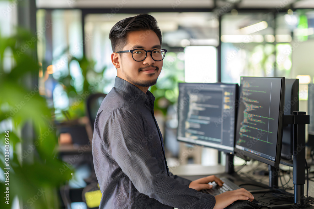 Wall mural focused young asian programmer coding at desk in modern office, developing software for it startup.  - Wall murals Wall mural focused young asian programmer coding at desk in modern office, developing software for it startup. - Wall murals