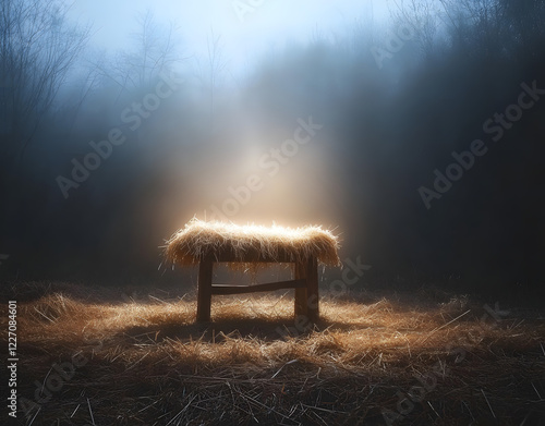 The watermark will not be included on Wall mural.: Fog and empty manger with light falling on it - waiting for the messiah