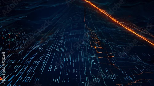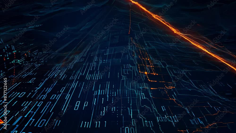 Wall mural footage with a digital high-tech matrix, an image of a binary code in blue and orange neon tones