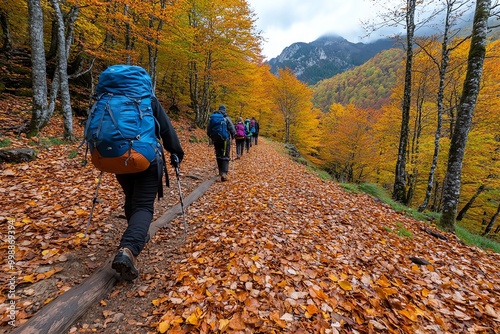 Wall mural : Forest trail in autumn mountains, where hikers walk along a path covered in fallen leaves, surrounde