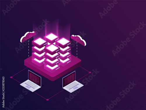 The watermark will not be included on Wall mural.: Four servers connected with laptops on purple background isometric design for data management concep