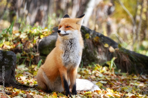 The watermark will not be included on Wall mural.: Fox looking out through the trees in the mystical forest in autumn