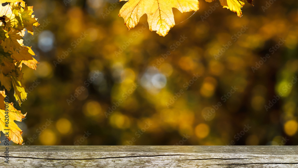 Wall mural frame from maple leaves in sunny autumn nature scene background with empty tree bole for display spa