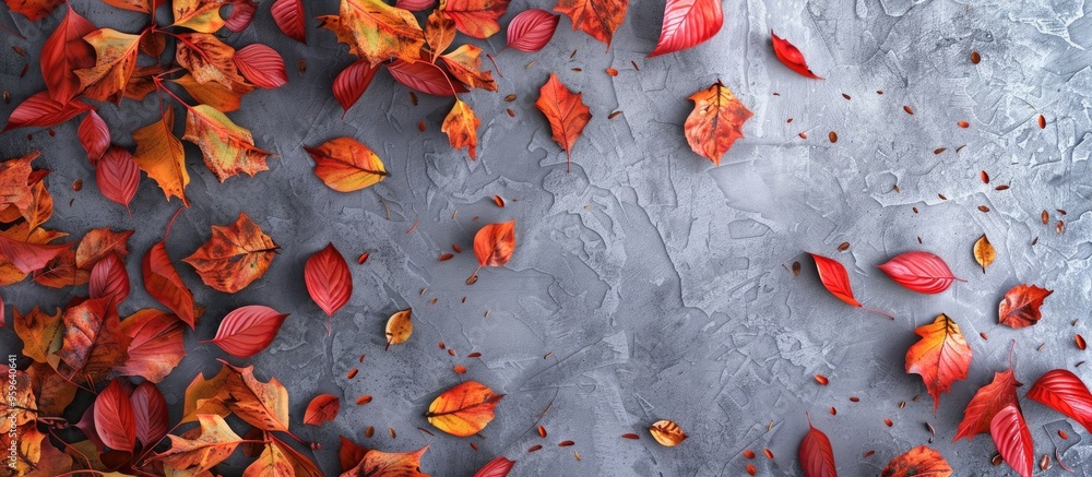 Wall mural frame of vibrant fallen autumn leaves on a gray backdrop. copy space image. place for adding text an - Wall murals Wall mural frame of vibrant fallen autumn leaves on a gray backdrop. copy space image. place for adding text an - Wall murals