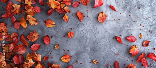 Wall mural frame of vibrant fallen autumn leaves on a gray backdrop. copy space image. place for adding text an