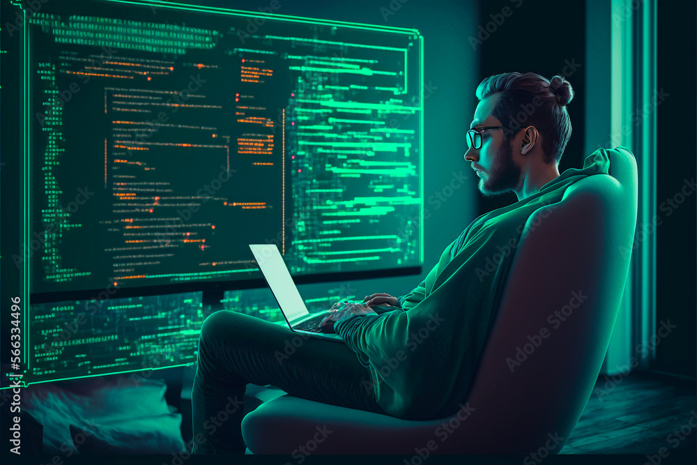Wall mural freelancer program developer working on new app software, sitting in comfortable chair, typing in fr - Wall murals Wall mural freelancer program developer working on new app software, sitting in comfortable chair, typing in fr - Wall murals