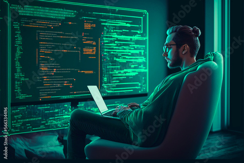 Wall mural : Freelancer program developer working on new app software, sitting in comfortable chair, typing in fr