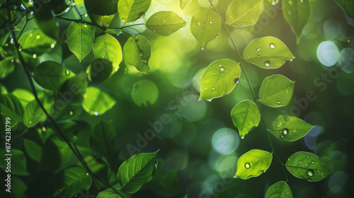 Wall mural fresh green leaves with sunlight bokeh and drops. nature background for design and print