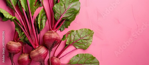 Wall mural fresh leaf beet root isolated on pastel background. copy space image. place for adding text and desi