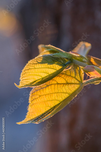 Wall mural fresh leaves on a branch in spring with sun behind, close-up.