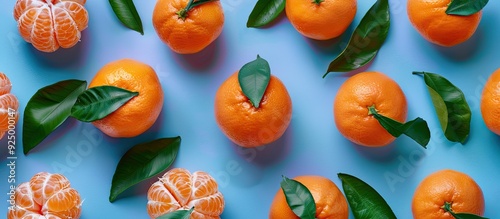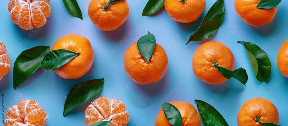 The watermark will not be included on Wall mural.: Fresh ripe mandarins with vibrant green leaves placed on a colorful backdrop viewed from above with