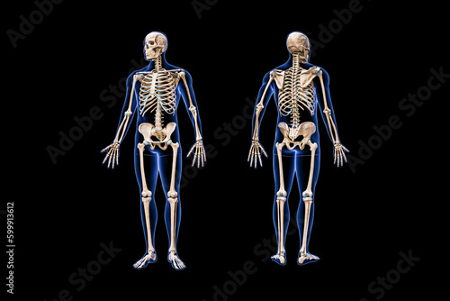 Wall mural : Front and back views of full human skeleton with male body 3d rendering illustration isolated on bla