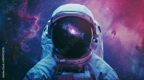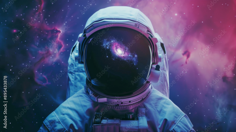 The watermark will not be included on Wall mural.: Front view astronaut potrait - astronaut in space suit with galaxy and nebula reflection in helmet gl