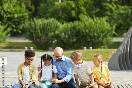 The watermark will not be included on Wall mural.: Front view at multi-ethnic group of children using tablets and smartphones while sitting in row outd