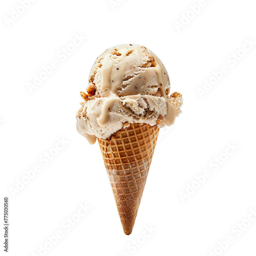 The watermark will not be included on Wall mural.: Front view of a delicious looking single caramel apple crisp ice cream scoop on a cone levitating in