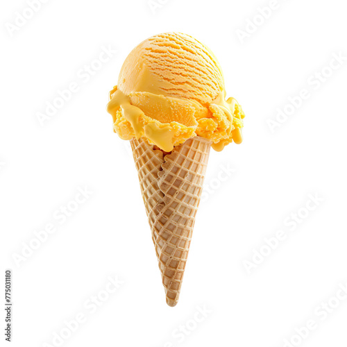 The watermark will not be included on Wall mural.: Front view of a delicious looking single peach mango swirl ice cream scoop on a cone levitating in t