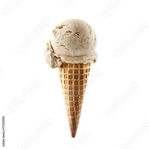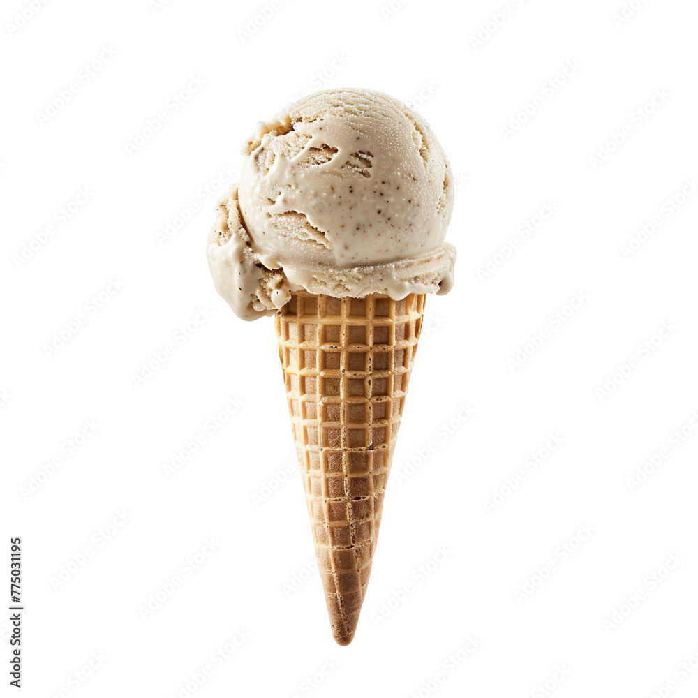 The watermark will not be included on Wall mural.: Front view of a delicious looking single peanut butter banana ice cream scoop on a cone levitating i