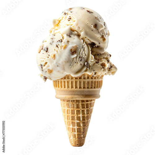 The watermark will not be included on Wall mural.: Front view of a delicious looking single peanut butter banana split ice cream scoop on a cone levita
