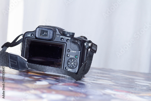 The watermark will not be included on Wall mural.: Front view of a digital camera on a table