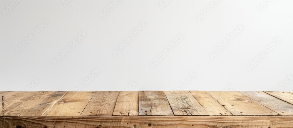 The watermark will not be included on Wall mural.: Front view of an empty wooden table with a white background perfect for incorporating a copy space i