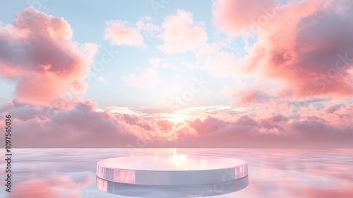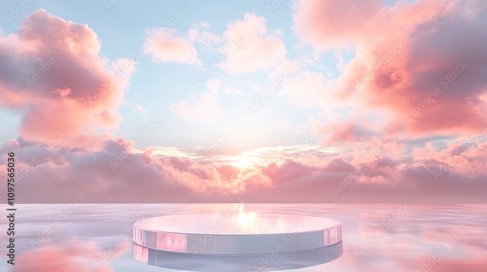 Wall mural front view of transparent podium decorated with pinky cloudy sky background abstract content. - Wall murals Wall mural front view of transparent podium decorated with pinky cloudy sky background abstract content. - Wall murals
