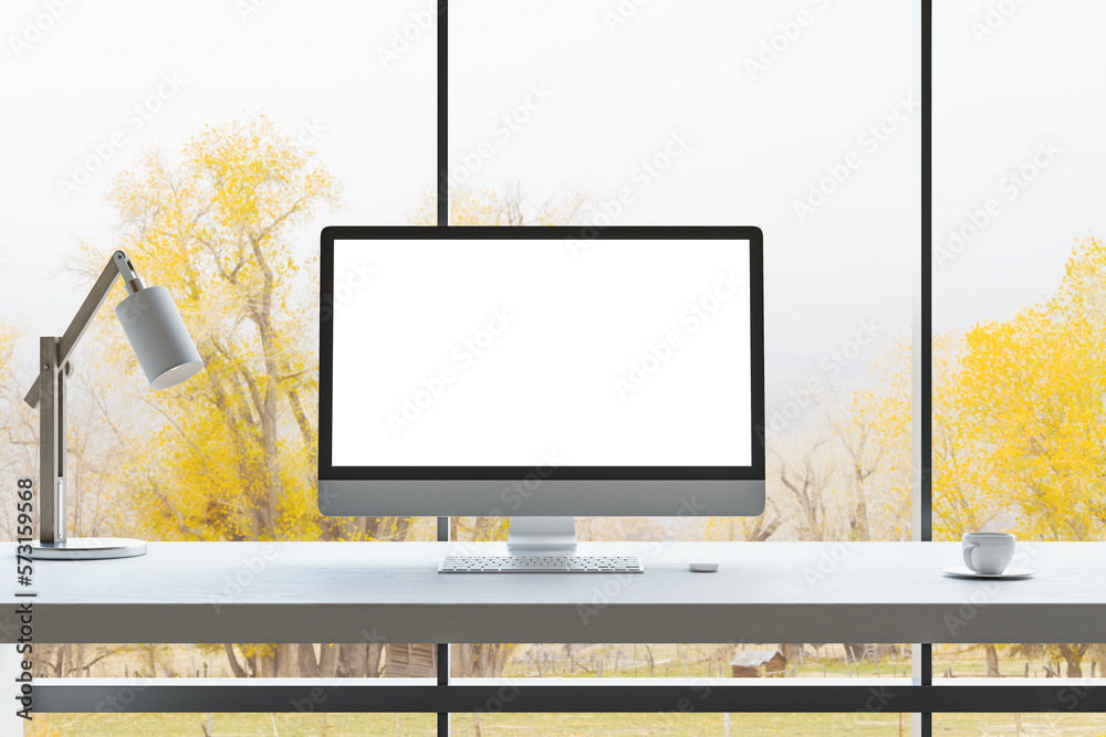 Wall mural front view on blank white modern computer monitor with space for your logo or text on light work sur