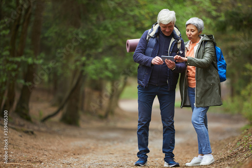 The watermark will not be included on Wall mural.: Full length portrait of active senior couple using navigation app via smartphone while enjoying hike