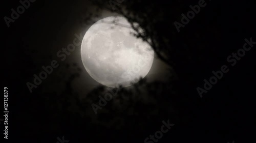 The watermark will not be included on Wall mural.: Full moon behind almost naked tree branches and twigs, leaves and twigs slightly moving in wind, sel
