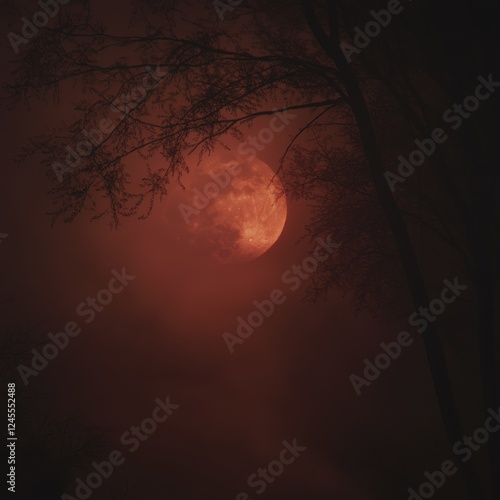 The watermark will not be included on Wall mural.: Full moon illuminated through tree branches with swirling mist background at night sky