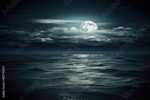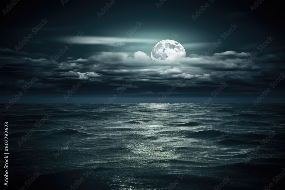 The watermark will not be included on Wall mural.: Full moon reflecting on the calm ocean waters at night generative ai