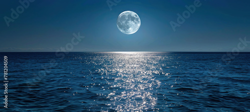 The watermark will not be included on Wall mural.: Full moon rising over a calm ocean, casting a path of shimmering silver on the water surface -