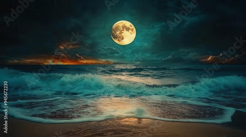 The watermark will not be included on Wall mural.: Full moon rising over the ocean, casting a mystical glow on the water and beach -